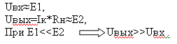Небольшое входное напряжение создает заметный ток эмиттера, который проходит в коллектор (Iк≤ Iэ), работа тока Iк в нагрузке (Rн) обеспечивает мощный источник Е2.