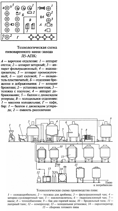 Процесс получения пива состоит из следующих операций: производство пивного сусла, кипячение, главное брожение, дображивание, розлив. Комплект оборудования включает аппараты: заторный, промывочный (фильтрационный), отстоя, промежуточный, брожения (2 шт.), дображи-вания (7 шт.), моечную установку, водонагреватель, пластинчатый охладитель, машину холодильную.
