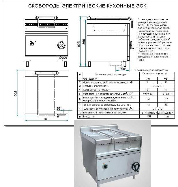 Сковорода электрическая кухонная типа ЭСК, предназначена для жарки продуктов основным способом, пассирования овощей, тушения, а также припускания мясных рыбных и овощных блюд на крупных предприятиях общественного питания. Сковорода имеет плавную регулировку температуры жарочной поверхности в диапазоне 20-275 С. Дно чаши тощиной 10 мм позволяет надежно удерживать тепло в режиме приготовления. Сковорода оснащена механизмом подъёма и опускания чаши, что обеспечивает удобство опорожнения и обслуживания сковороды. Крышка предотвращает потерю тепла и фиксируется в любом положении. Сковорода изготовлена с применением только импортных комплектующих.
