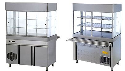 Испаритель холодильного агрегата расположен в верхней части холодильного прилавка, благодаря этому, захолаживание объема камеры происходит достаточно быстро и холодильный агрегат работает более экономично. Поднимающиеся дверцы витрины обеспечивают удобное извлечение блюд из нее, 12 дверей (6 со стороны покупателя, 6 со стороны обслуживающего персонала) позволяют пользоваться всем объемом камеры без общей потери холода. Полки в холодильной витрине выполнены из нержавеющих решеток, что позволяет осуществлять уборку внутри камеры, а также беспрепятственно захолаживать объем.